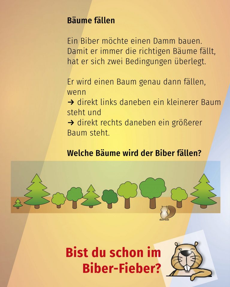 Wenn Du Schülerin oder Schüler unseres Gymnasiums bist, melde Dich in der Zeit vom 10. bis 21.11.2025 bei Deiner bzw. Deinem Informatiklehrer, um Zugangsdaten zu erhalten. Unter https://bwinf.de/informatik-biber/aufgaben/#c1090 sind Aufgaben vergangener Jahre einsehbar.