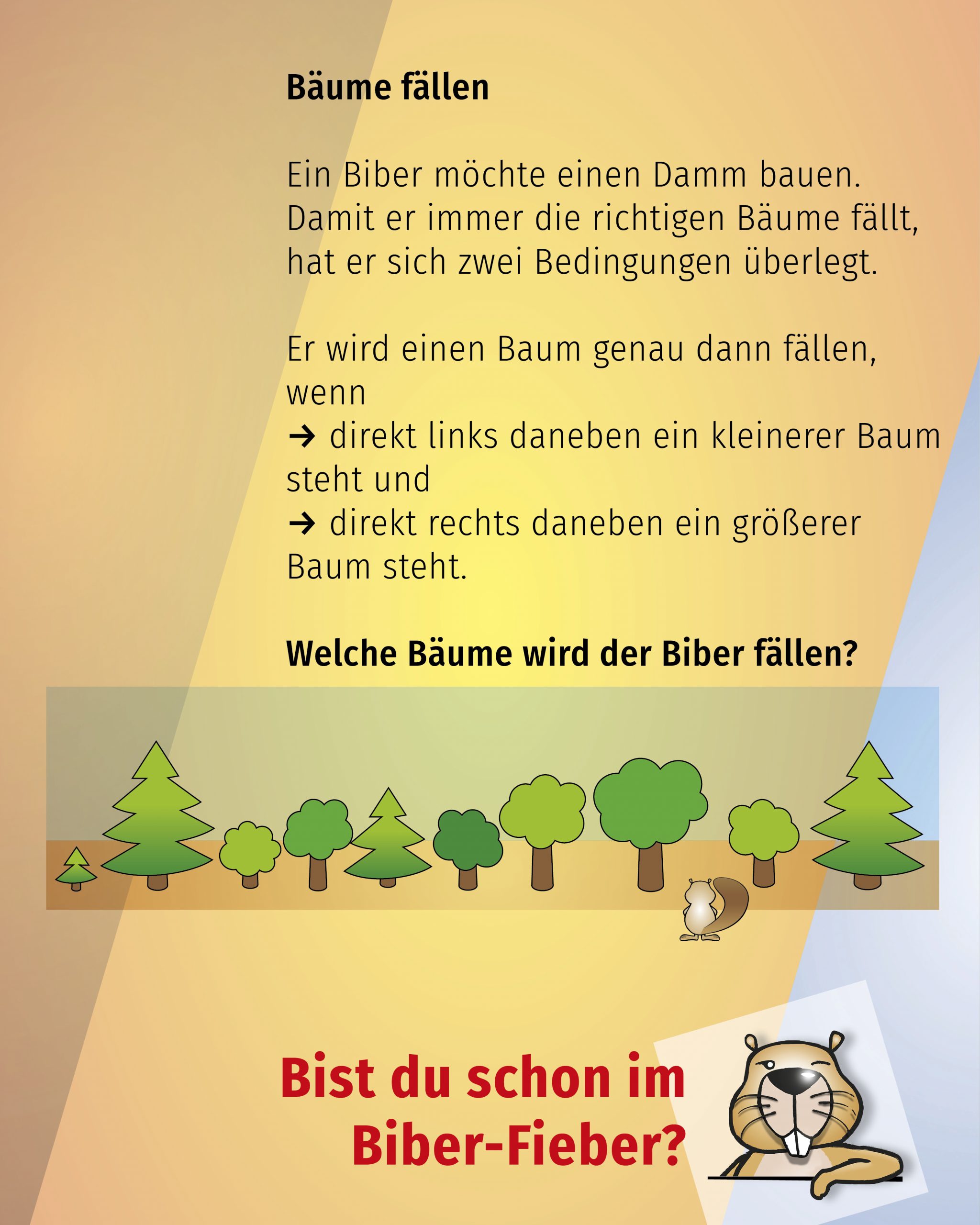 Wenn Du Schülerin oder Schüler unseres Gymnasiums bist, melde Dich in der Zeit vom 10. bis 21.11.2025 bei Deiner bzw. Deinem Informatiklehrer, um Zugangsdaten zu erhalten. Unter https://bwinf.de/informatik-biber/aufgaben/#c1090 sind Aufgaben vergangener Jahre einsehbar.