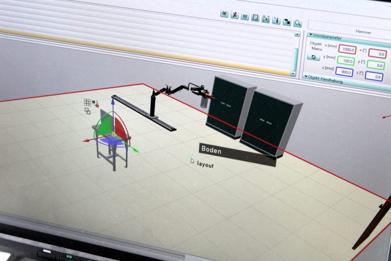 Bereits nach wenigen Wochen sind große Fortschritte sichtbar. Das Programm, welches für die Prozessoptimierung in Fabriken entwickelt wurde, wird von den Schülerinnen und Schülern zunehmend souverän bedient – hier wollen Bibliotheken mit Objekten durchforstet werden und Attribute von Elementen entsprechend angepasst, dies natürlich alles an den X-Y-Z-Achsen, da man ja dreidimensional arbeitet.
