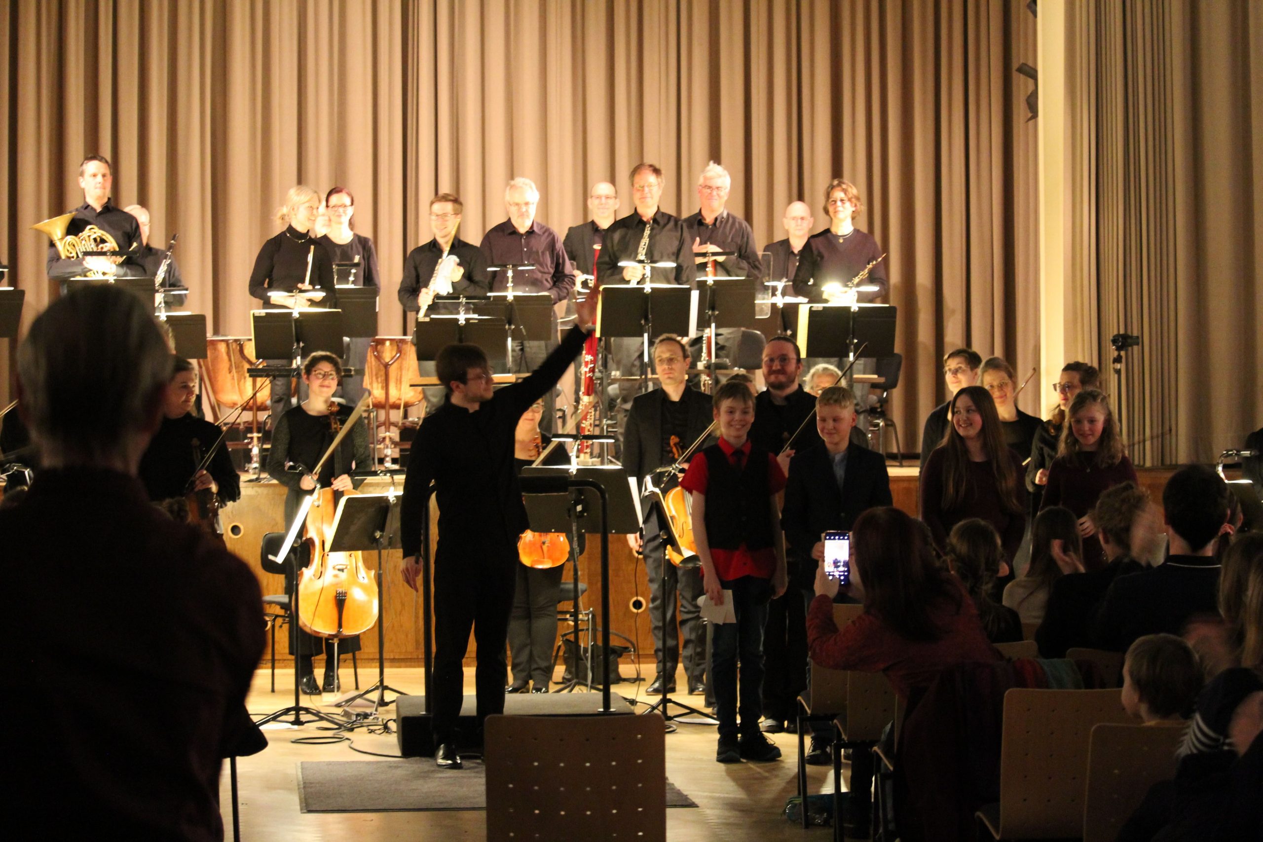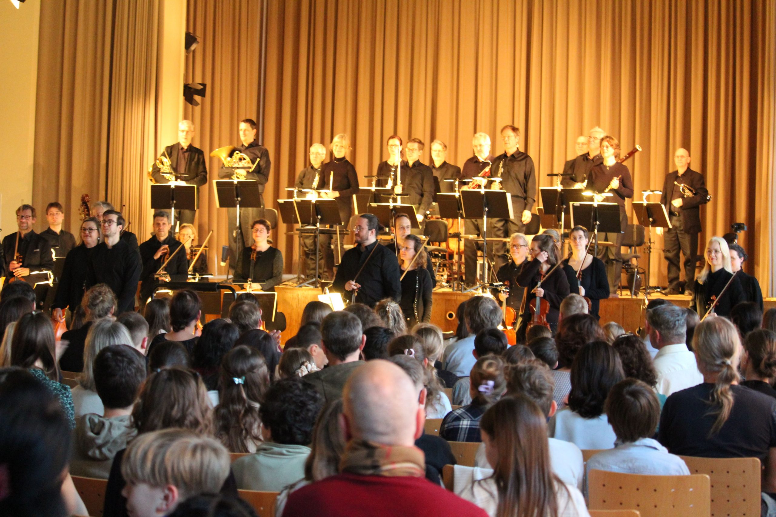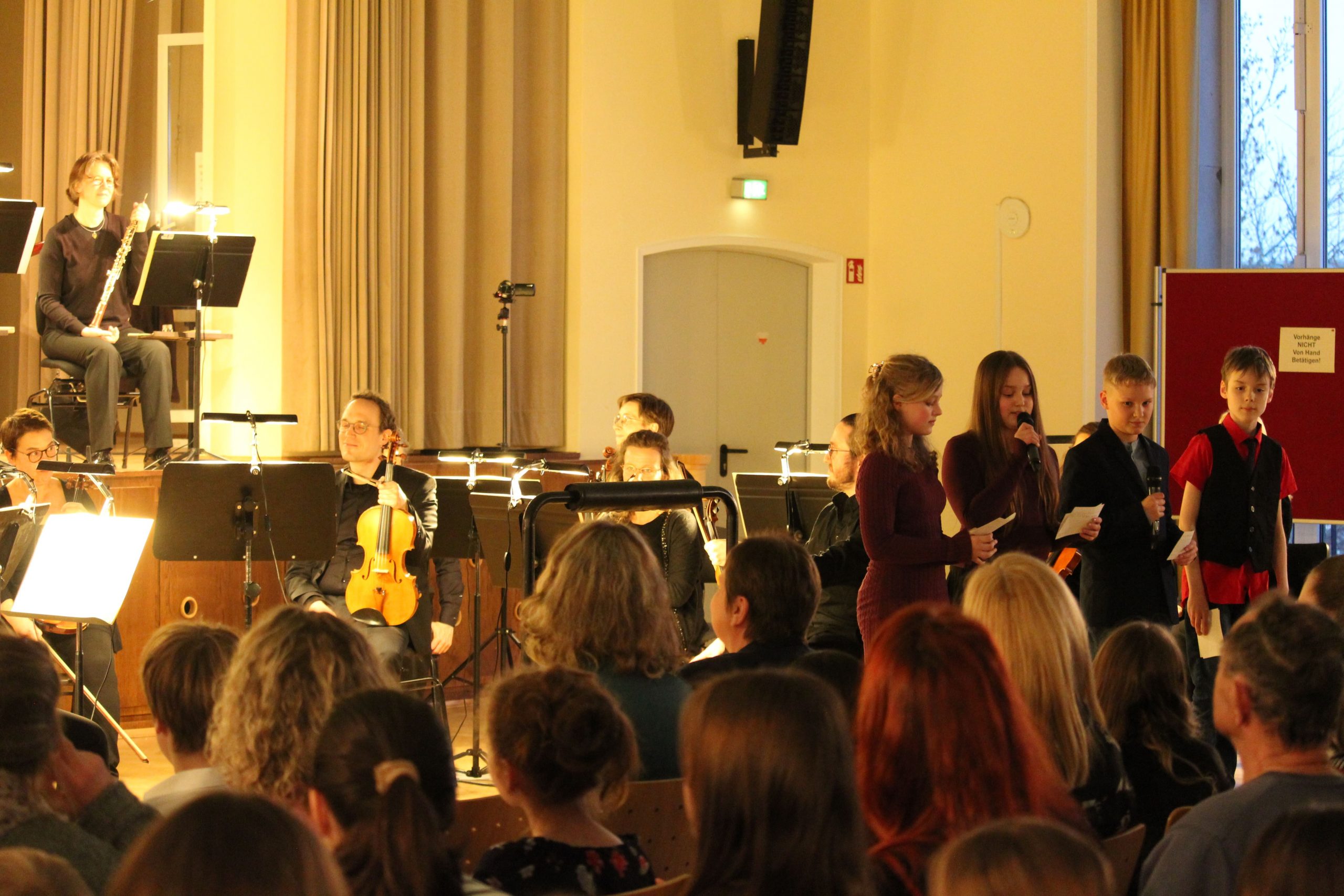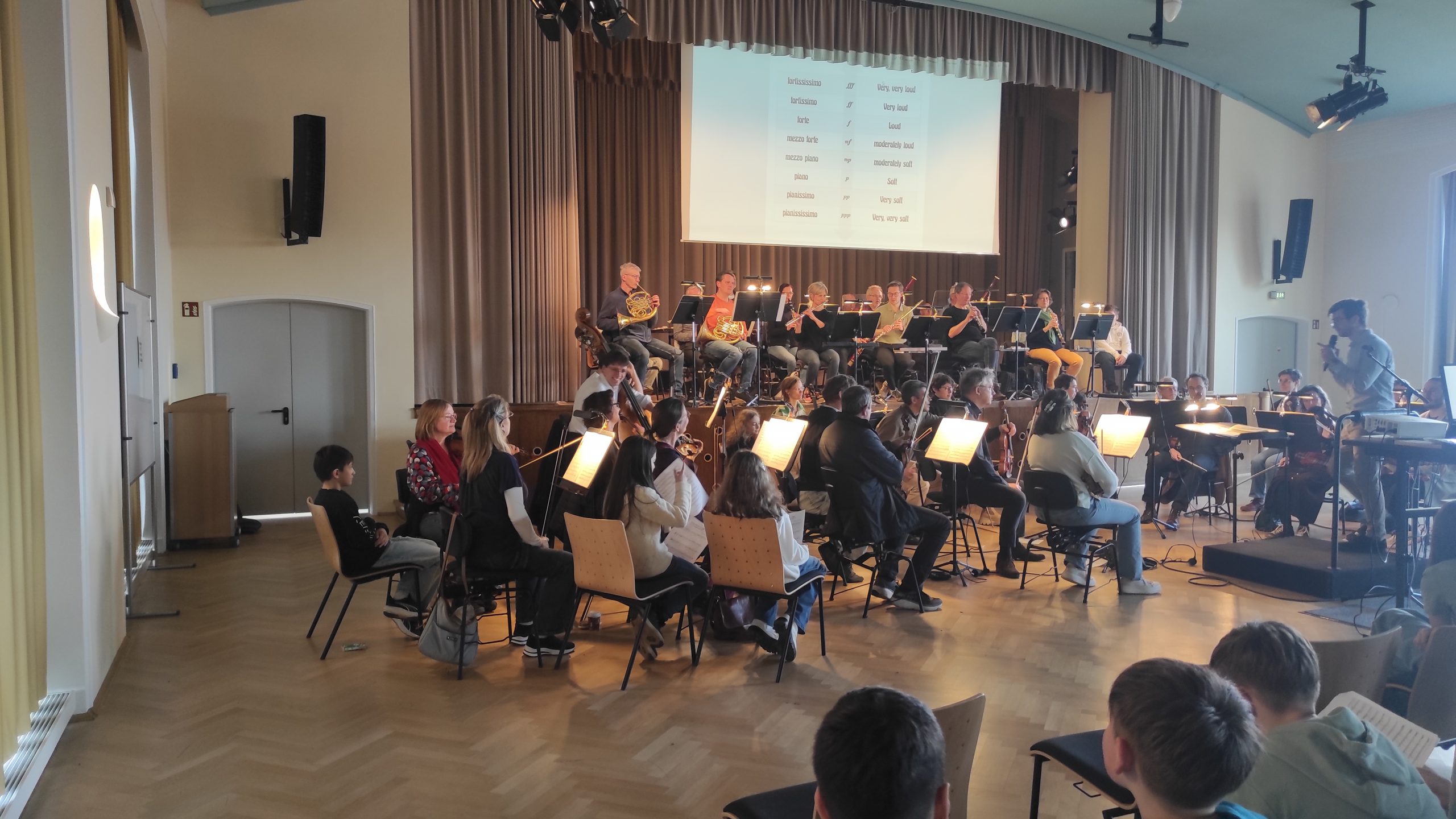 Da am Abend auch die Eltern eingeladen waren, die Aufführung zu besuchen, waren die 400 Stühle der Aula fast voll besetzt, als Dirigent, Instrumentalisten und Moderatoren ihr Konzert aufführten. Aber was erzählt ein Kind aus der sechsten Klasse denn, wenn es plötzlich ein Sinfonie-Konzert moderiert? Ganz einfach!