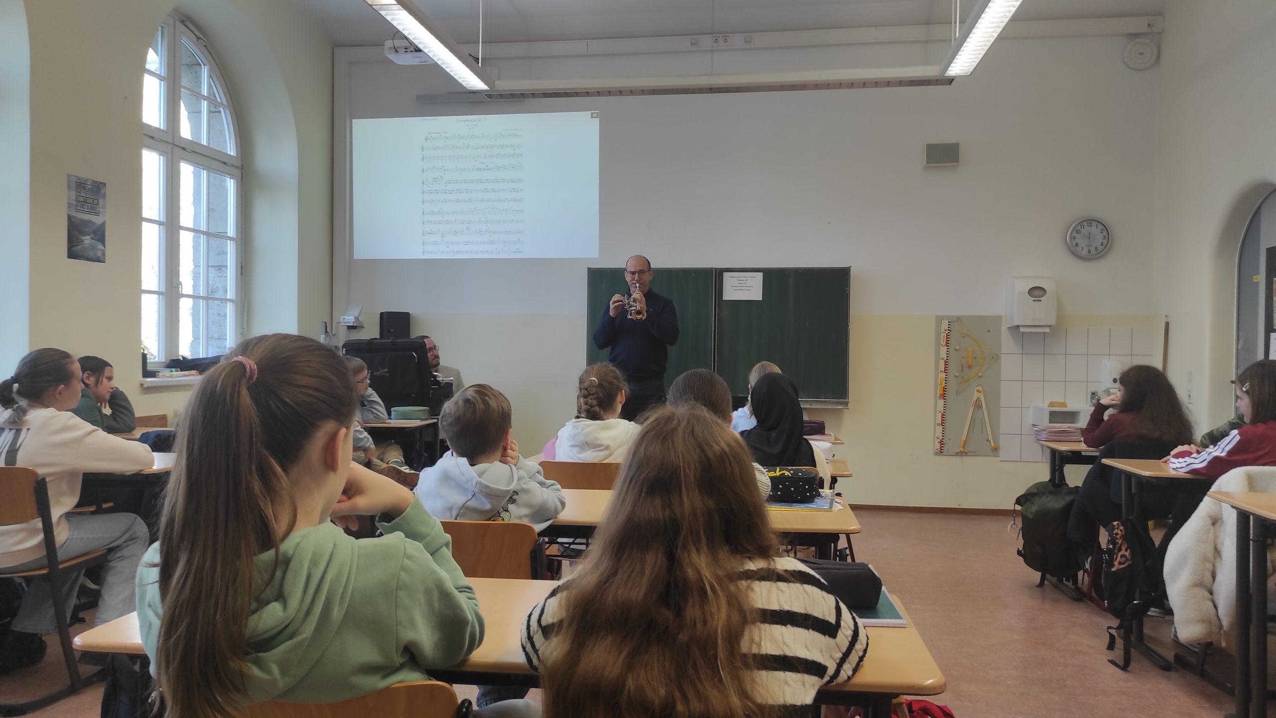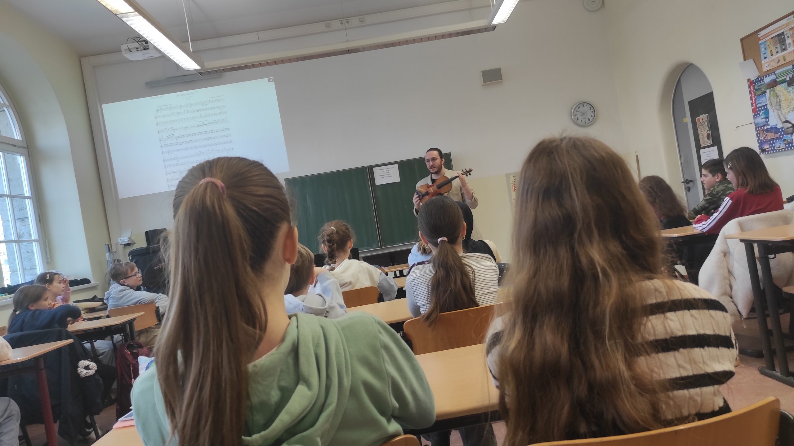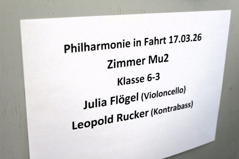 Am 17.3.2026 fuhr ein Lastwagen der Theater Chemnitz auf den Schulhof. Im Gepäck hatte er jede Menge Instrumente der Robert-Schumann-Philharmonie, und auch 40 Musikerinnen und Musiker reisten an, um sich in Klasse 5 und 6 vorzustellen. Das Projekt namens „Philharmonie in Fahrt“ umfasste einen ganzen Unterrichtstag mit etwa 180 Kindern, die alle in einer Musikstunde zwei Instrumentalisten und deren Instrumente kennenlernten: Violoncello, Kontrabass, unterschiedliche Geigen, Metall- und Holzbläser – in jeder Klasse waren unterschiedliche Profimusiker und erzählten über sich und ihr Instrument.