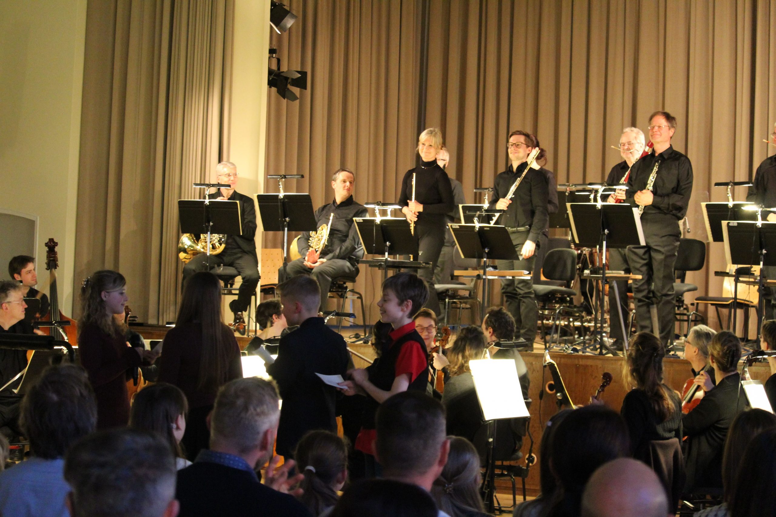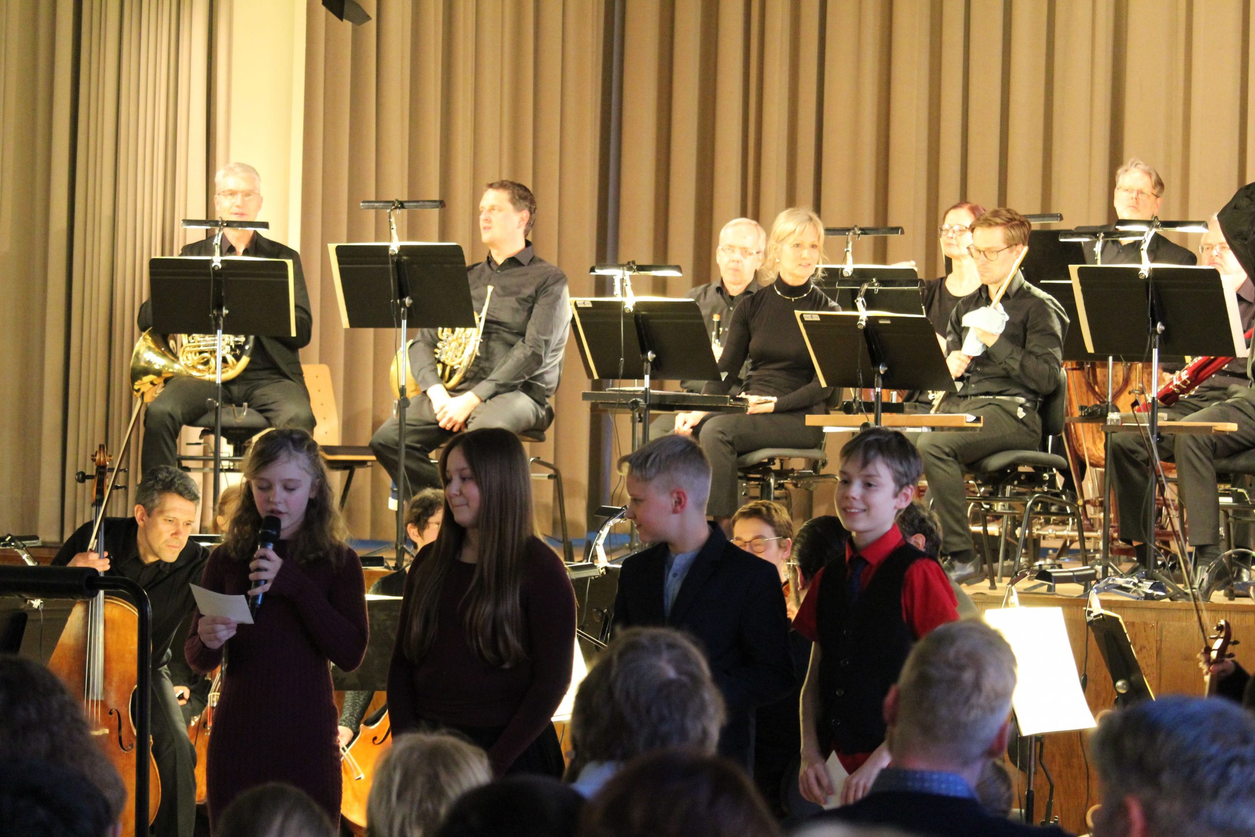 Zuerst stellt man am besten die Instrumentengruppen vor – die kennt der geschulte Sechstklässler bzw. die geschulte Sechstklässlerin ja vom Vormittag sehr genau – und dann berichtet man von seinen eigenen Eindrücken. Welches Instrument war am besten? Der Kontrabass mit den tiefen Tönen ist toll, Trompeten sind schön laut und die Flöten sind sehr wichtig für die Melodie. Am Ende muss sich ein gutes Moderatorenteam natürlich bedanken: beim Dirigenten, bei den Musikern, bei den Musiklehrerinnen des Gymnasiums und bei der Schulleitung, die gemeinsam den Projekttag für die Kinder umgesetzt haben. Genau diese Aufgabe hat das Team aus vier Schülermoderatoren super gemacht und den Organisatoren und Gästen hat das Konzert daher viel Spaß bereitet.