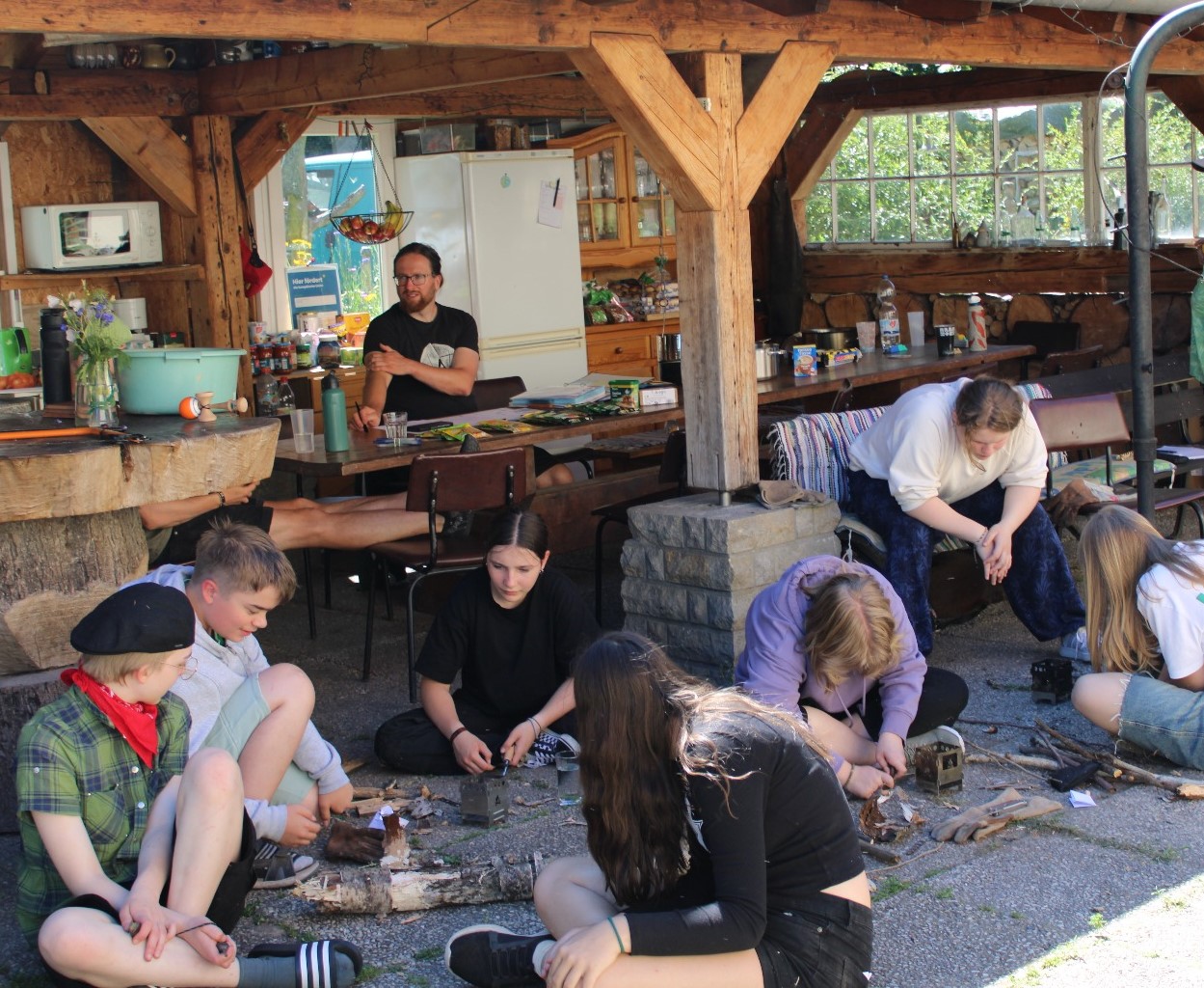 Anschließend begann das Arbeiten, wir teilten uns in zwei Gruppen auf und während die eine Gruppe einkaufen ging, schufteten meine Gruppe und ich im naheliegenden Wald, damit wir immer viel Feuerholz hatten, z. B. zum Essen kochen oder generell für Wärme. Dann endlich, Marcel rief uns zu einer langersehnten Pause, welche wir, so gut wir konnten, ausnutzten, um unsere Muskeln neu zu mobilisieren, da diese vom vielen Holz schleppen schon ganz schön schmerzten.