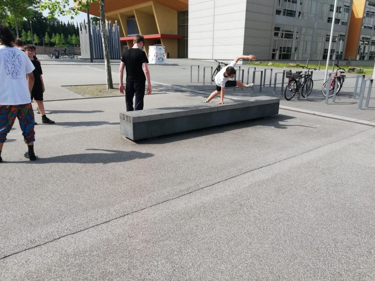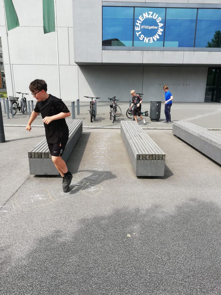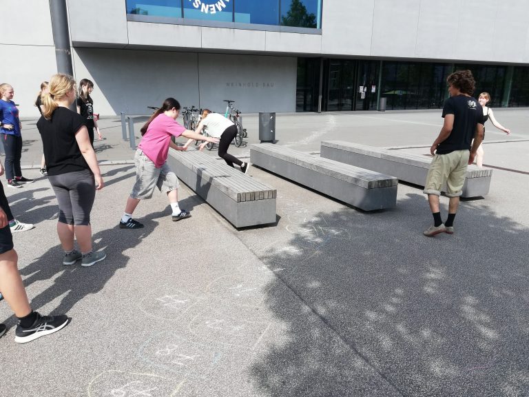Logischerweise wollte der Fachbereich Sport auch neue Sportarten zeigen, welche die meisten Schülerinnen und Schüler aus Klasse 7 noch nicht probiert hatten. Dazu gehörte Urban Parkour, eine Sportart, bei der man sich mit Geschick und Präzision durch städtische Umgebungen bewegt, indem man Hindernisse wie Mauern, Zäune, Geländer und Gebäude überwindet. Wir fingen allerdings klein an, mit einem lustigen Erwärmungsspiel und dem Überwinden der Bänke vor dem Zentralen Hörsaalgebäude der TU Chemnitz.