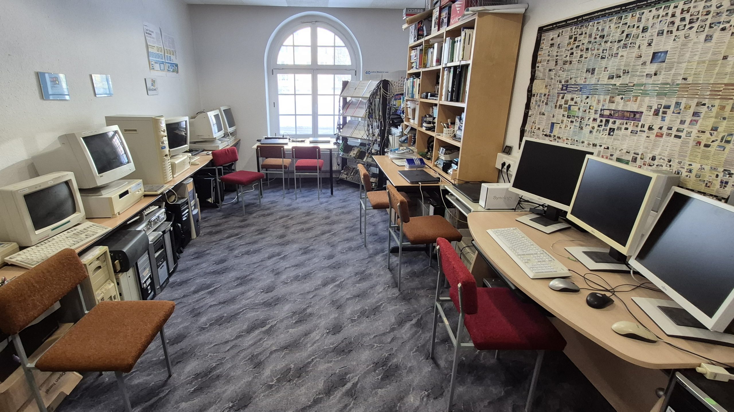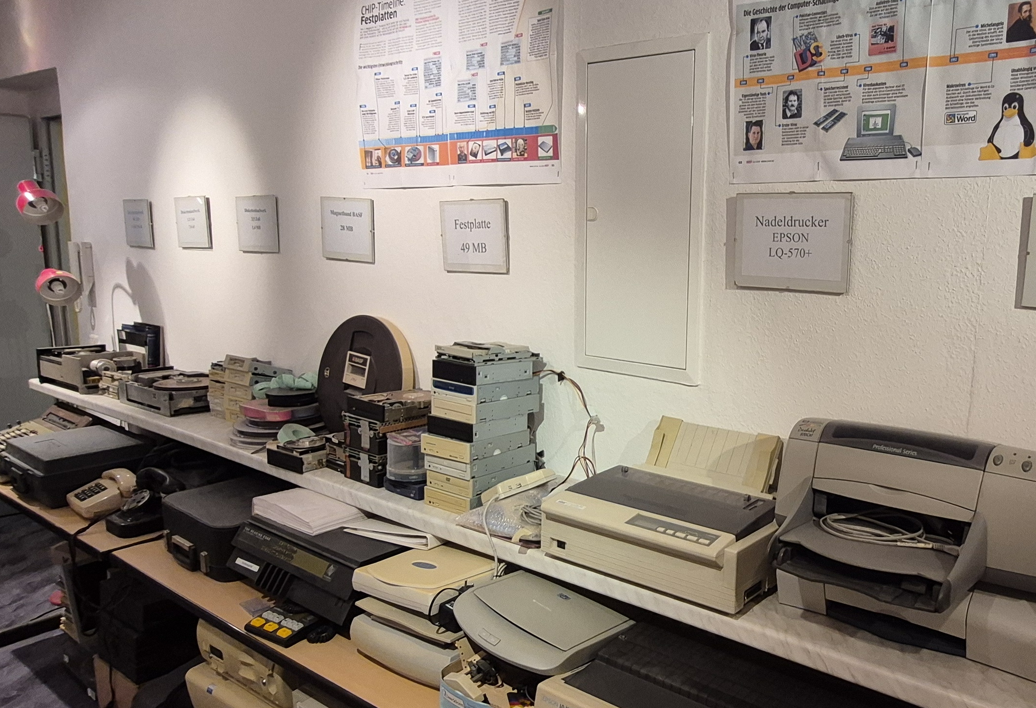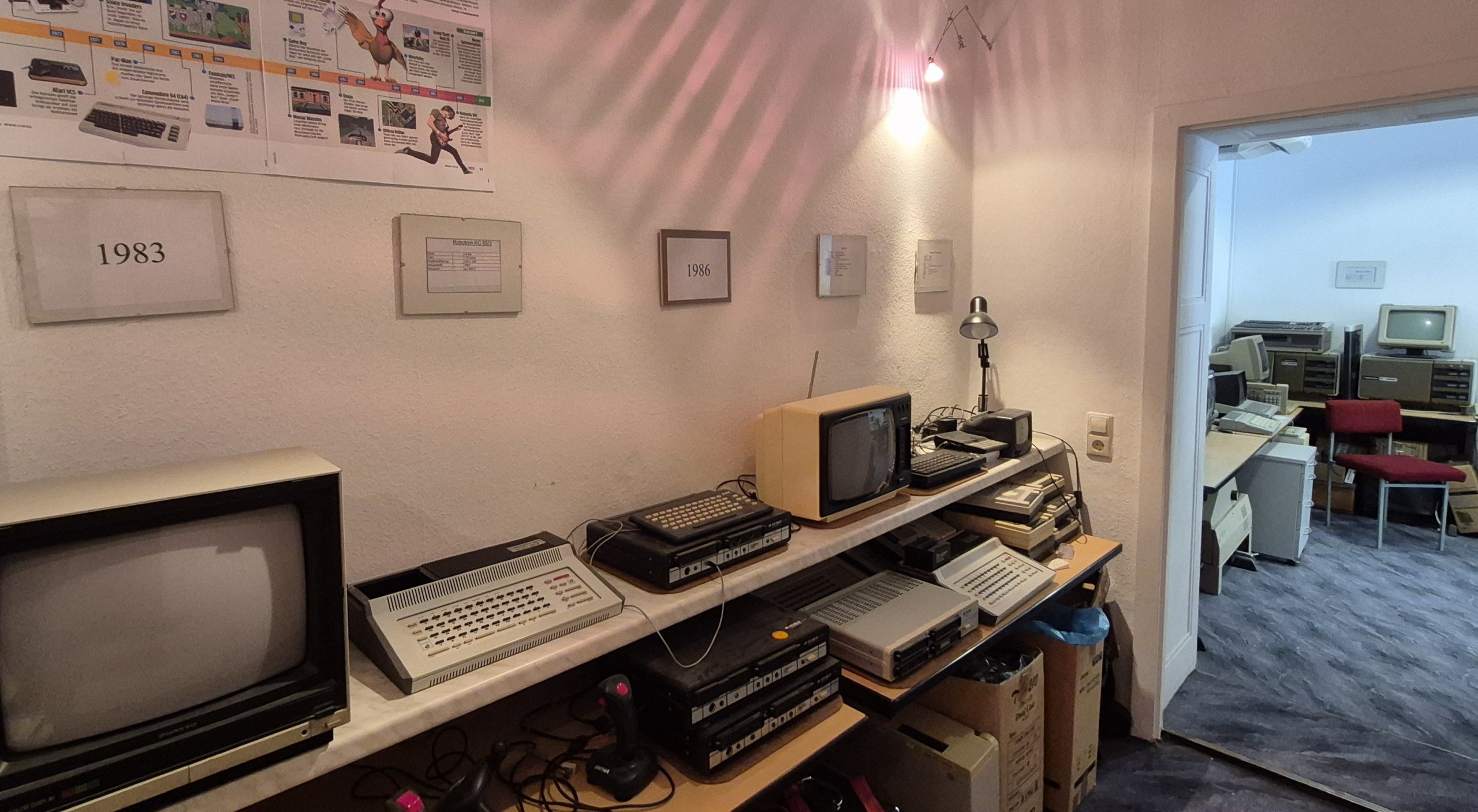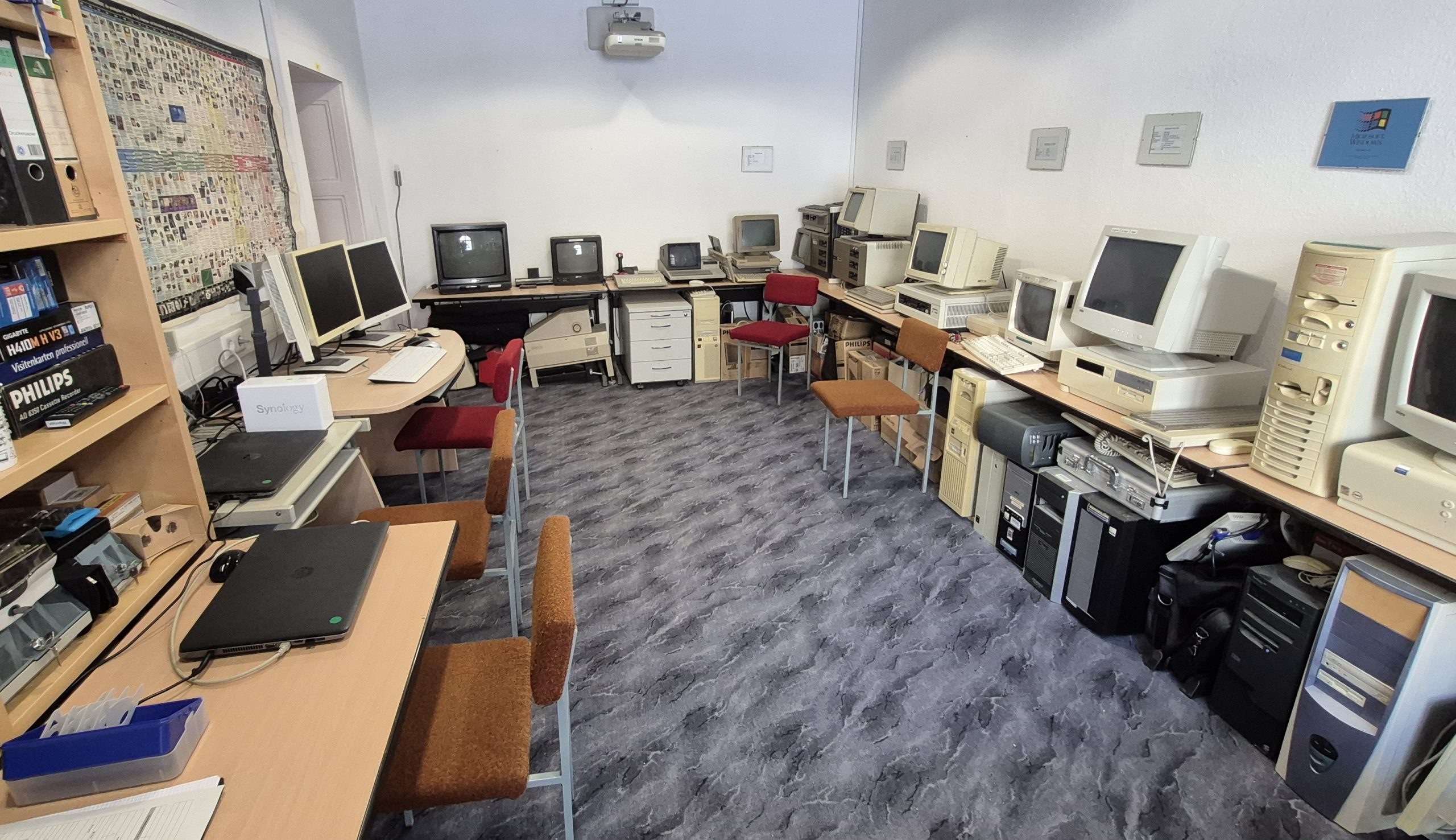 Blick in das Computermuseum, das ab dem Schuljahr 2003/2004 entstand. Die Renovierung wurde von unserem ehemaligen Hausmeister Herrn Reinhardt durchgeführt. Die Exponate sind Spenden von Eltern, Lehrern und Technik von geschlossenen Schulen. Die oben verlinkte Datenbank hat unser ehemaligen Schüler Stephan Tischer im Rahmen einer Projektarbeit erstellt.